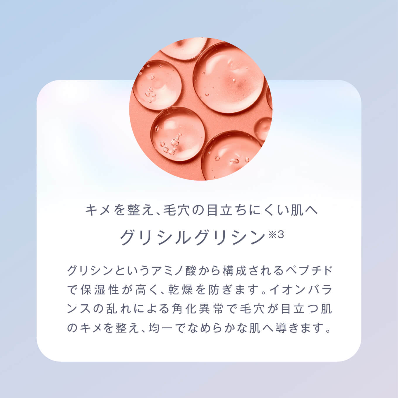 美容クリニックの最前線をホームケアに。 皮脂や毛穴トラブルが気になる肌に、ひきしめ成分を中心に肌バリアを整える乳液です。高濃度※2アゼライン酸誘導体※1をはじめとする3つのひきしめ成分アゼライン酸誘導体※1、グリシルグリシン※3、ナイアシンアミド※4が肌の油分・水分のバランスを整えながら、肌をひきしめて、毛穴の目立ちにくいなめらかな肌へ整えます。肌荒れを抑えつつ、セラミド成分※5が肌バリアを整えることでなめらかな肌へと導きます。 ※1 アゼロイルジグリシンK、水(整肌成分)、※2 取り使い製品比において、※3 グリシルグリシン(整肌成分)、※4 ナイアシンアミド(整肌成分)、※5 ラウロイルグルタミン酸ジ(フィトステリル/オクチルドデシル)(整肌成分) |
