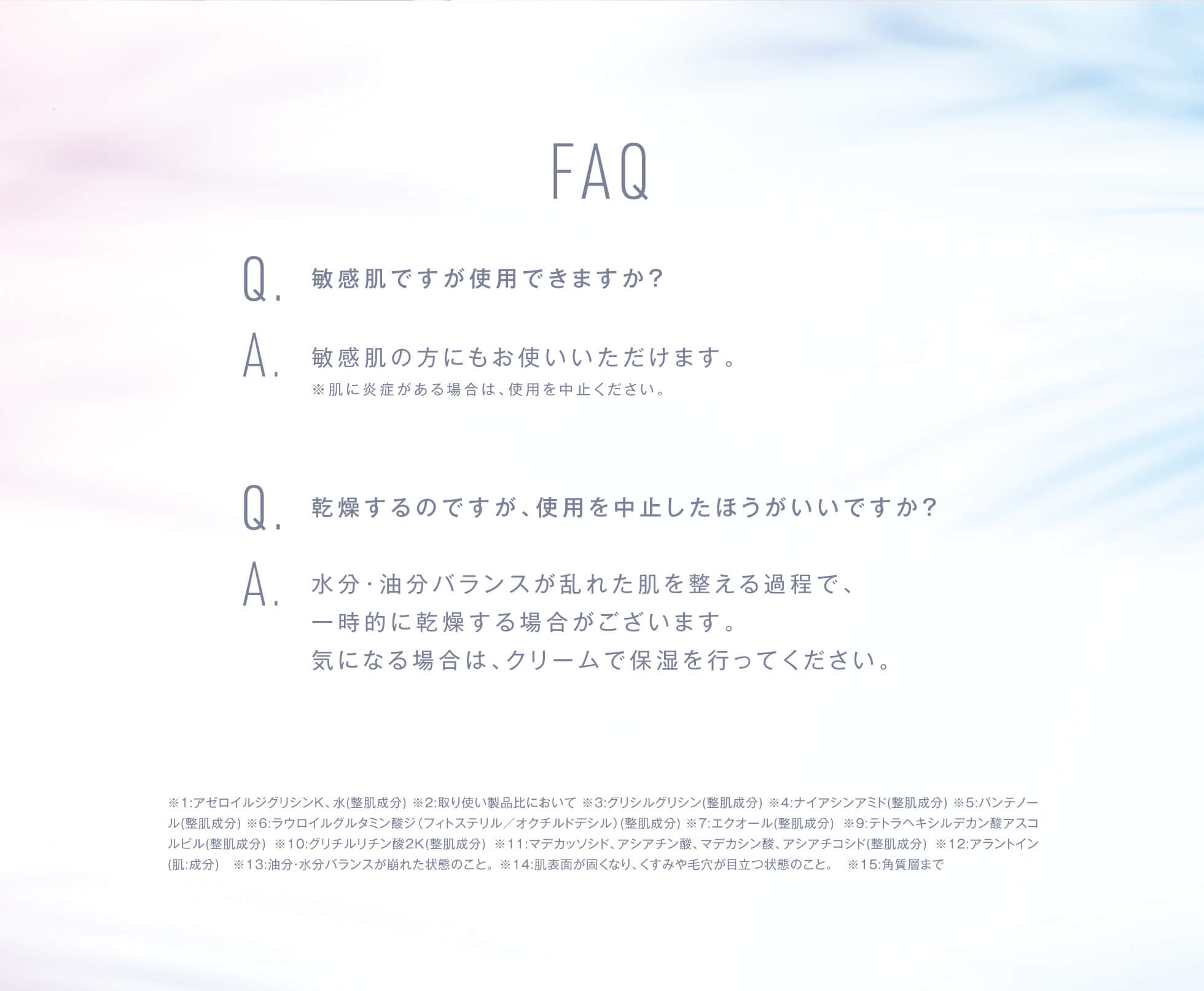 | 成分 | 水、BG、プロパンジオール、DPG、トリエチルヘキサノイン、スクワラン、トリ(カプリル酸/カプリン酸)グリセリル、ステアリン酸ソルビタン、ジメチコン、テトラヘキシルデカン酸アスコルビル、アゼロイルジグリシンK、パンテノール、グリシルグリシン、グリチルリチン酸2K、(アスコルビル/トコフェリル)リン酸K、トコフェロール、トロメタミン、ナイアシンアミド、アラントイン、ラウロイルグルタミン酸ジ(フィトステリル/オクチルドデシル)、マデカッソシド、アシアチン酸、マデカシン酸、アシアチコシド、セバシン酸、10-ヒドロキシデカン酸、1,10-デカンジオール、エクオール、ポリアクリレート-13、ステアリン酸グリセリル(SE)、エチルヘキシルグリセリン、ポリアクリレートクロスポリマー-6、ポリイソブテン、イソステアリン酸ソルビタン、ヤシ脂肪酸スクロース、ラウリン酸K、(PEG-240/デシルテトラデセス-20/HDI)コポリマー、ポリソルベート20、PPG-6デシルテトラデセス-30、t-ブタノール、ペンチレングリコール、リナロール、フェノキシエタノール |