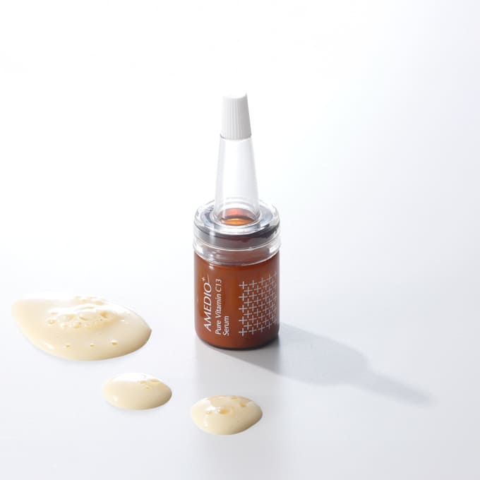 | 特徴 | ■ピュアV13C美容セラム 【濃密※1ピュアビタミンC※2を採用したマルチ処方美容液】 これまで製品化は難しいとされていたピュアビタミンC※2の浸透性※3を克服した独自のマルチ処方 【濃度13%のピュアビタミンC※2配合】 美容医療の現場で使われるビタミンCの濃度が平均9~10%なのに対し、AMEDIO+の美容液のピュアビタミンC※2の濃度は13%と濃密※1配合し、自宅ケアでも即効性※4を実感。 【10種以上の美容成分を独自にマルチ処方】 ヒアルロン酸の約16倍の保水力があり刺激性を和らげる※5と言われているβグルカンは、特殊技術で生産した低分子(約40万)のものを採用。 その他にも、グルタチオン、パンテノール、ヒアルロン酸などを配合し、ピュアビタミンC※2による乾燥や刺激を感じづらい処方に。 使い続けることで実感できる肌育のために作られた独自処方の乳液タイプ美容液で、ビタミンCの効果をブーストすることが可能に。 ※1 しっとりとしたテクスチャーのこと ※2 アスコルビン酸(肌を整える成分) ※3 浸透は角質層まで ※4 化粧品で一般的に使用されるビタミンC(アスコルビン酸誘導体)は他成分と結合していて、体内で誘導体部分が切られてビタミンCへ変換され効果を発揮するまでステップを要する一方、ピュアなビタミンC(アスコルビン酸)は角質層へ浸透後にビタミンCが本来持っている効果作用を発揮します。 ※5 スティンギングテスト実施済み。全ての方に刺激が起こらないということではありません。 ■バイオセルロースビュアマスク 『ラップ療法』から着想美容液の浸透率※6と効果を高める独自開発のフェイスマスク 【ラップ療法着想の高密着バイオセルロースマスク】 医療の現場で使用されるラップ療法に着想を得て作られたフェイスマスクは、「第二の皮膚」と呼ばれるバイオセルロースという細かい繊維で構成。 肌のしわや毛穴までしっかりと密着することで、美容液の浸透をサポート。 【美容液に合わせたオリジナル処方のフェイスマスク】 フェイスマスクには、美容液のピュアビタミンC※7の力をブーストしてくれる、ナイアシンアミド5%やビタミンE※8、保湿力のあるヒト型セラミド、ペプチド、グルタチオンなどを配合。 美容液のピュアビタミンC※7の刺激を抑え、効果をブーストしてくれる処方にし、使い続けることで肌の土台※9を整えることができる肌育コンセプト。 ※6 浸透は角質層まで ※7 アスコルビン酸(肌を整える成分) ※8 トコフェロール(保湿成分) ※9 保湿効果により肌のバリア機能を整える |